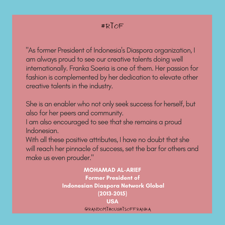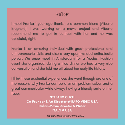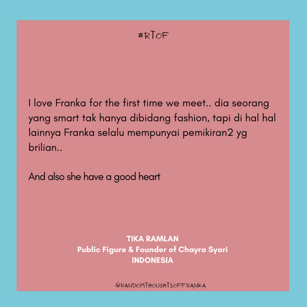 dunia tanpa akses dan privilege di industri fashion terpopuler saat ini: Modest Fashion. Dalam kesehariannya, Franka selalu menuliskan #randomthoughts nya secara rutin.